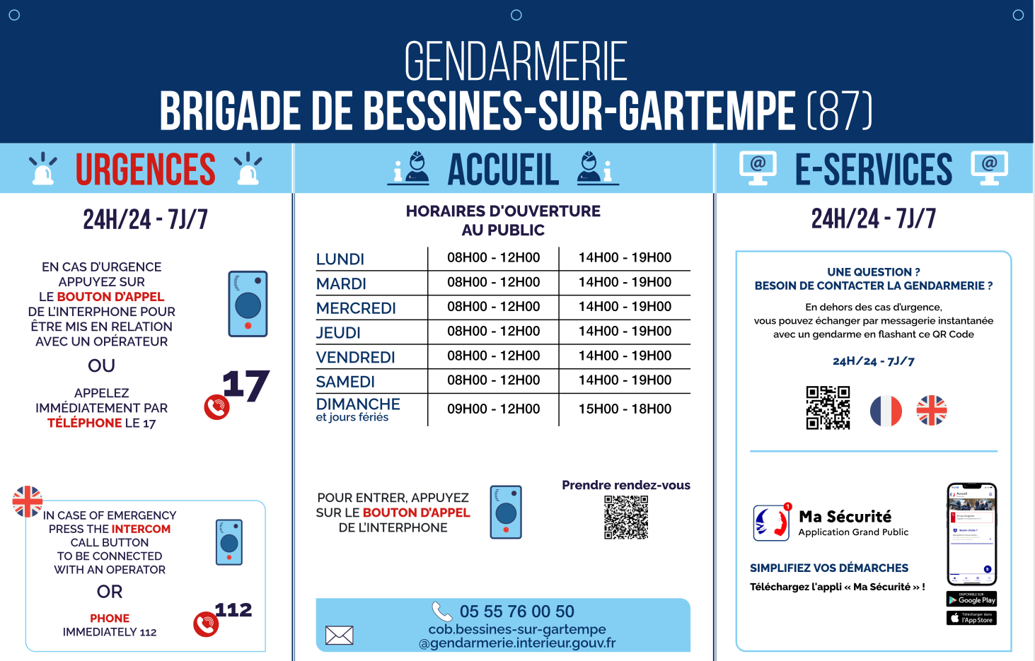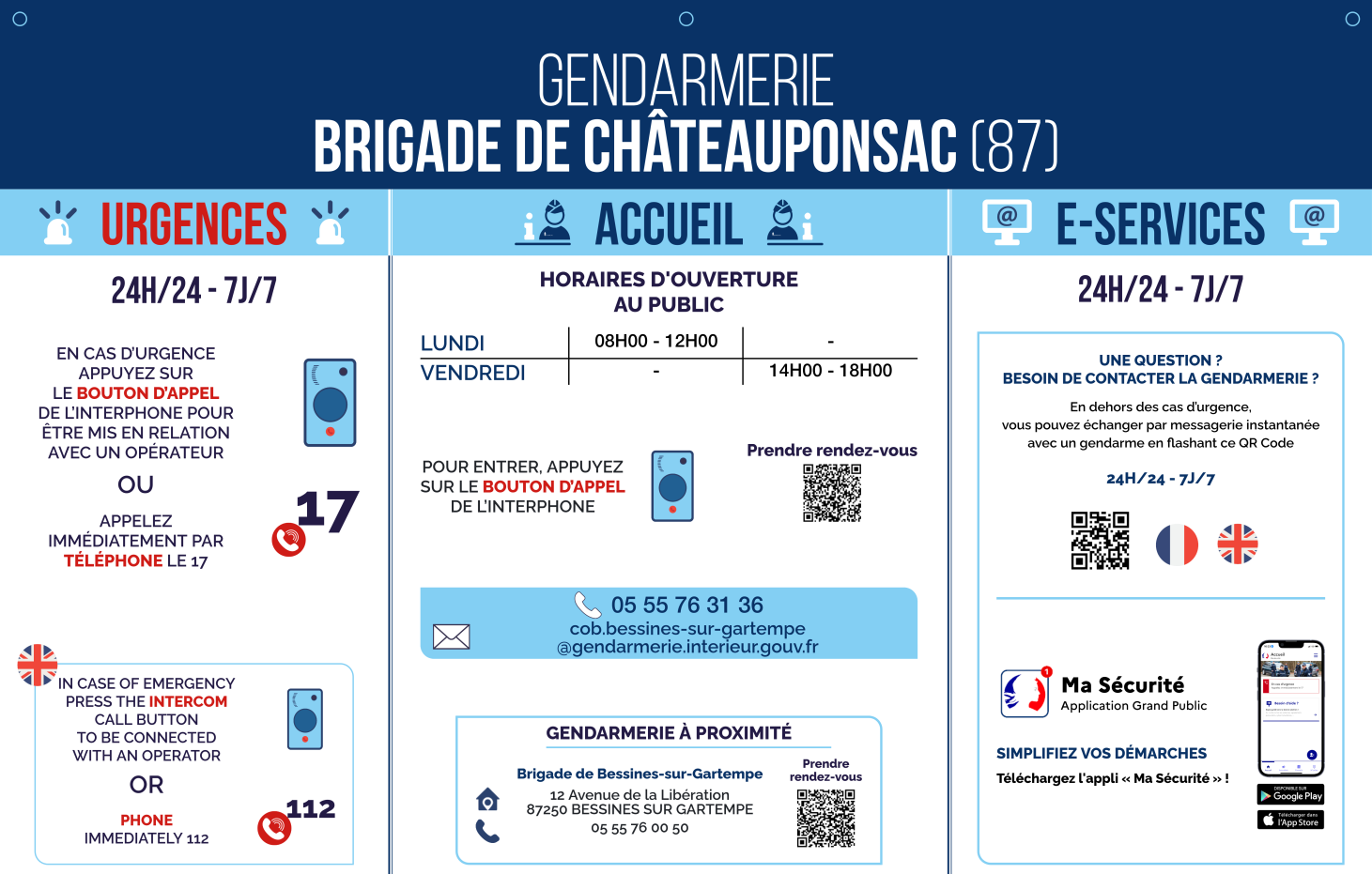 Bonjour et bienvenue sur le panneau-pocket de la communauté de brigades de Bessines sur Gartempe qui regroupe les brigades de gendarmerie de Bessines sur Gartempe et de Chateauponsac.