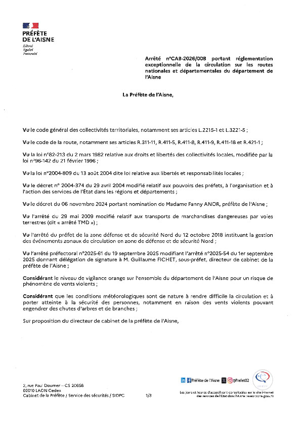 Météo-France a placé le département de l'Aisne en vigilance ORANGE pour le phénomène de vents violents en lien avec la tempête "GORETTI", du vendredi 9 janvier minuit au vendredi 9 janvier 08 heures. Ensuite, le département reste placé en vigilance JAUNE pour le vent jusqu'à 21 heures demain.