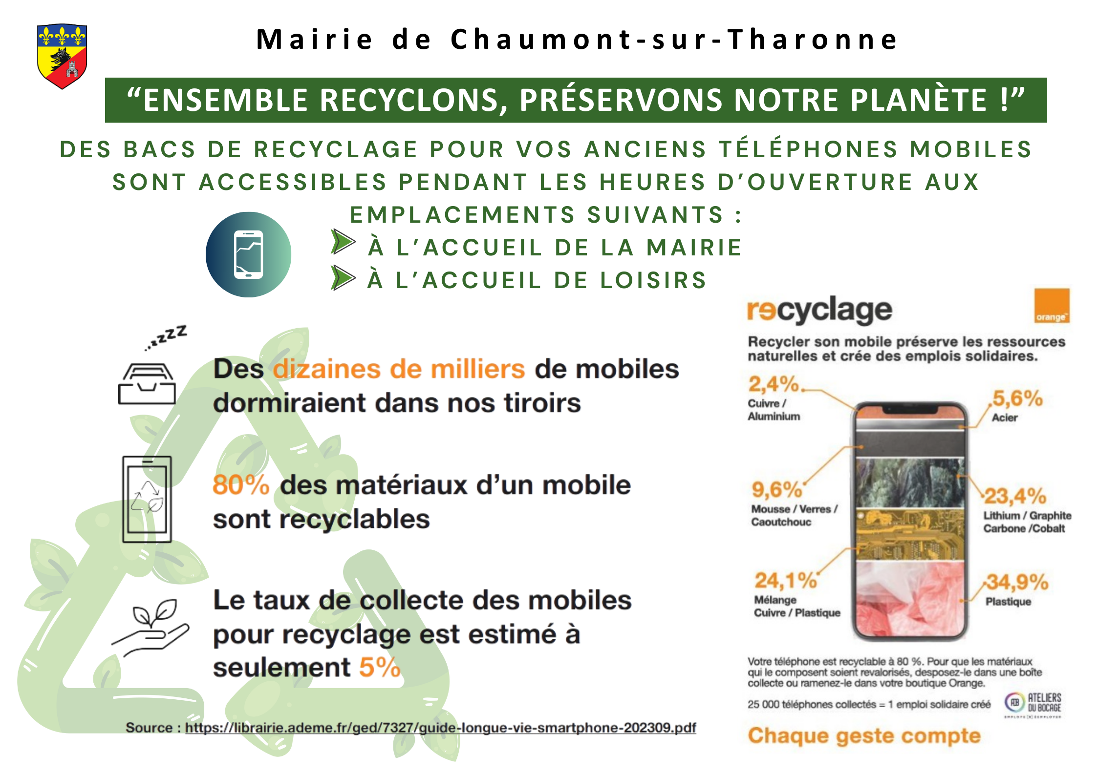 La commune agit pour l'environnement en mettant à votre disposition des bacs de recyclage pour vos anciens téléphones portables :