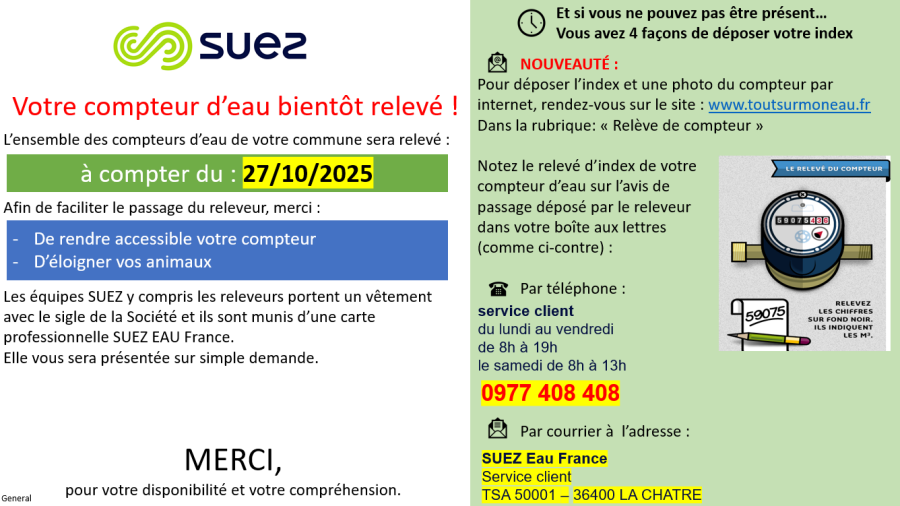 - Soit déposer l'index et une photo via internet: https://www.toutsurmoneau.fr/