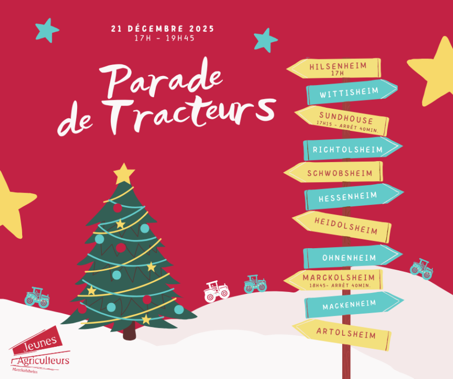 Les Jeunes Agriculteurs de Marmoutier auront le plaisir dâorganiser le dimanche 21 dĂ©cembre au soir une parade de NoĂ«l qui traversera plusieurs communes du secteur, dont la nĂŽtre.