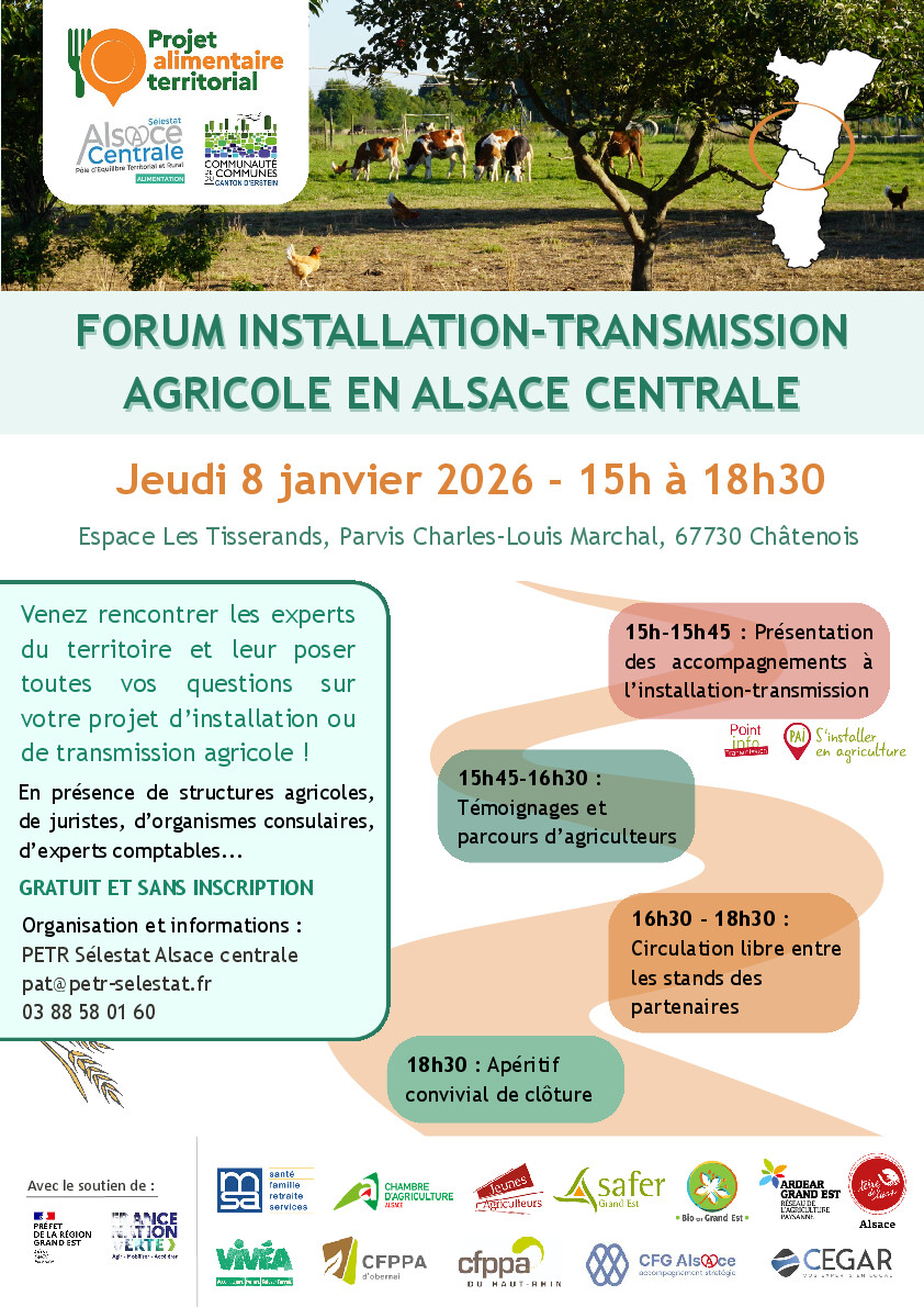 Cet Ă©vĂ©nement sâinscrit dans la volontĂ© du Projet Alimentaire Territorial de soutenir le renouvellement des gĂ©nĂ©rations agricoles en Alsace centrale.