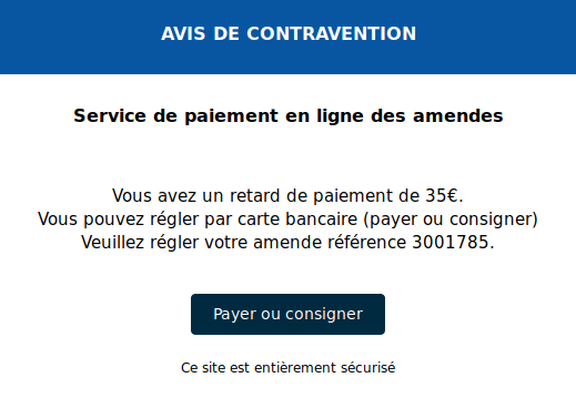 Le principe est simple, le SMS prĂ©texte que le destinataire a un « retard de paiement d'une amende », le message est suivi dâun lien amenant vers un site frauduleux comme « amendes-gouv.org », « dossier-antai-gouv.info », etc.