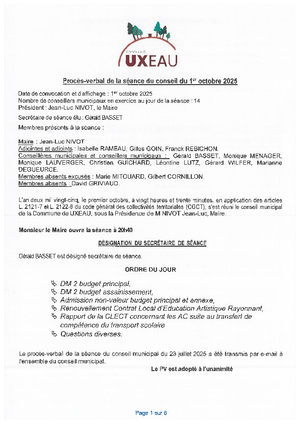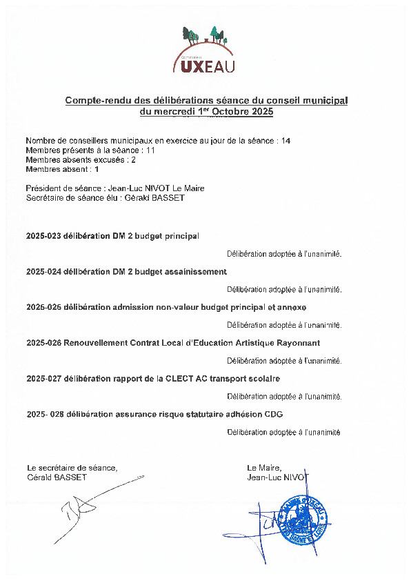 Ci-dessous le PV du conseil municipal du mercredi 1er octobre 2025 ainsi que le compte-rendu des délibérations