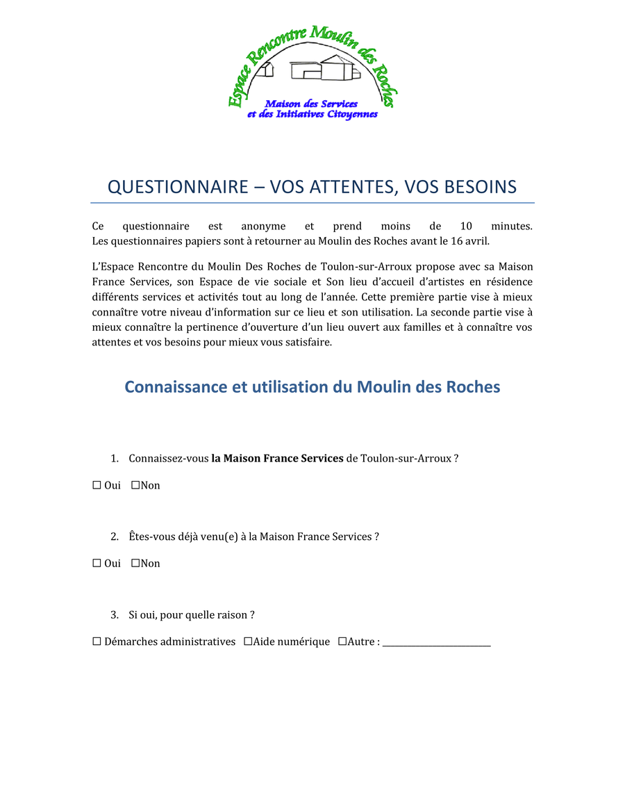 Si vous préférez vous pouvez également répondre via la version papier qui sera à retourner à l'accueil du Moulin Des Roches ou dans sa boite aux lettres avant le 16 avril.