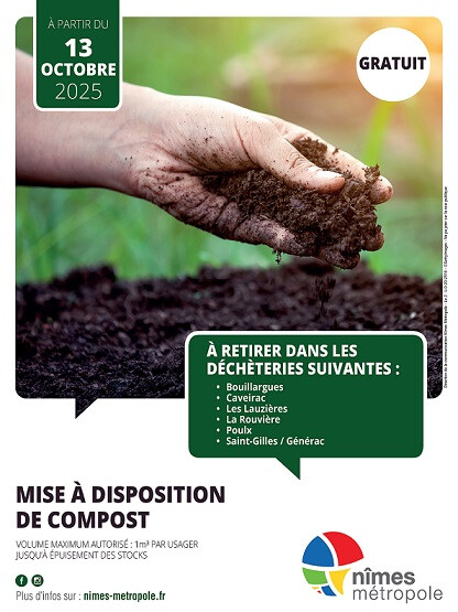 Dans le cadre de son projet « Territoire 100% compostage », l’Agglomération organise une distribution gratuite de compost pour tous les habitants à partir du lundi 13 octobre 2025 dans six déchèteries du territoire : Bouillargues, Caveirac, les Lauzières, La Rouvière, Poulx, Saint-Gilles/Générac. Une belle occasion d’adopter le jardinage durable !