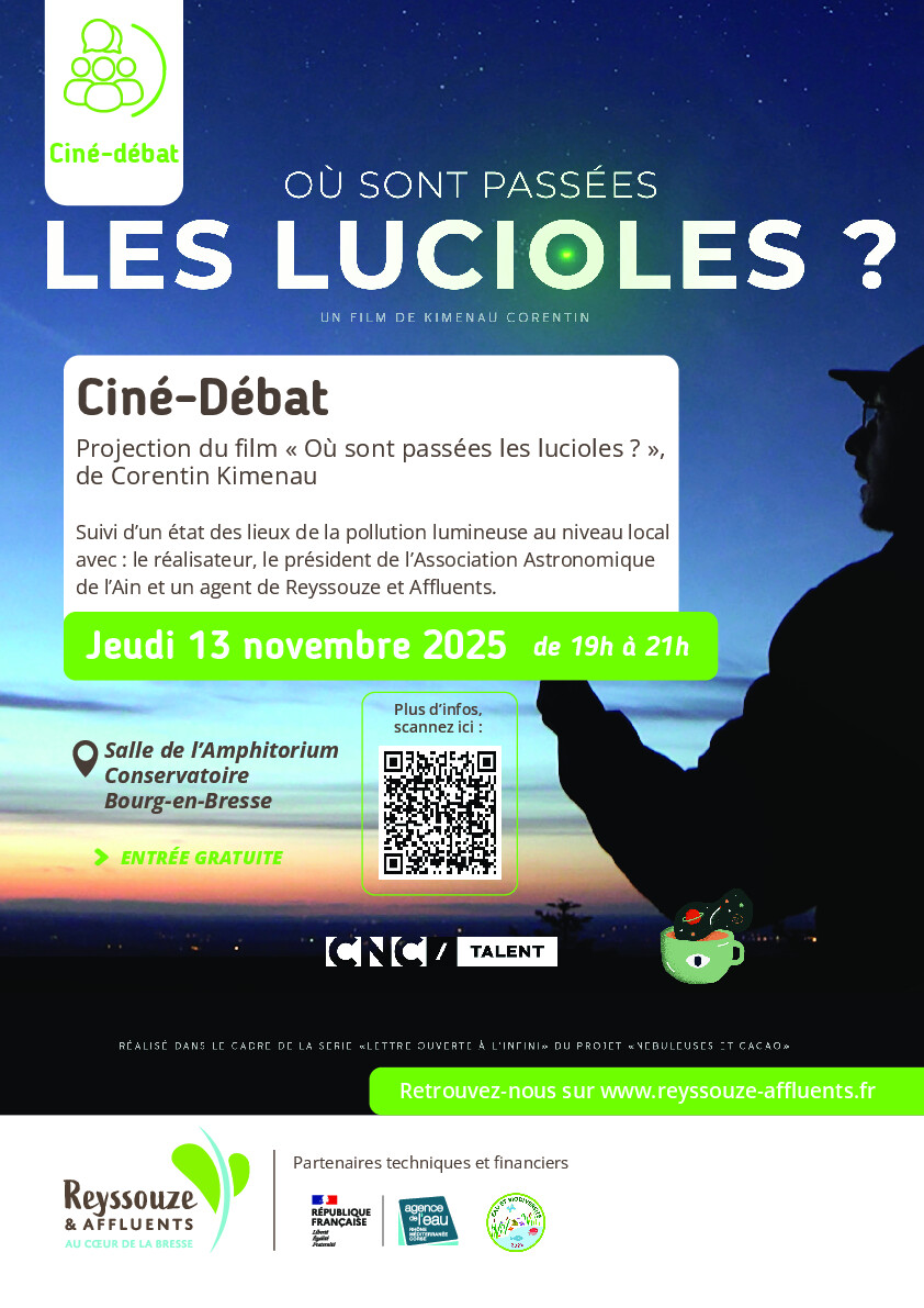 Reyssouze et Affluents vous invite à une soirée exceptionnelle articulée autour de la projection du film « Où sont passées les lucioles ? » de Corentin Kimenau, suivie d'une table ronde en présence du réalisateur et du président de l'Association Astronomique de l'Ain.