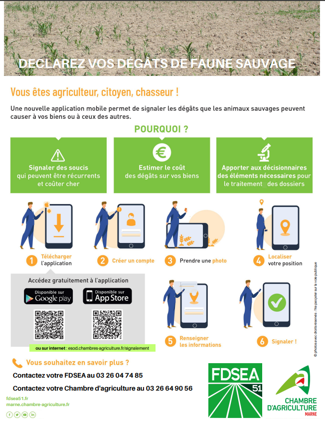 L’application "Signaler dégâts faune sauvage" permet aux agriculteurs et aux particuliers d'alerter gratuitement dès qu'un animal sauvage, quel qu'il soit, provoque des dégâts (hors sangliers, chevreuils et cervidés : procédure d’indemnisation via la FDCM).
