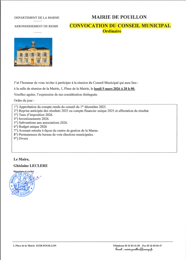 1, place de la Mairie 51220 Pouillon