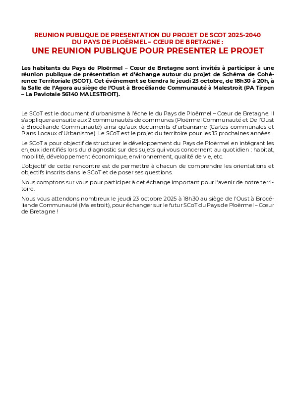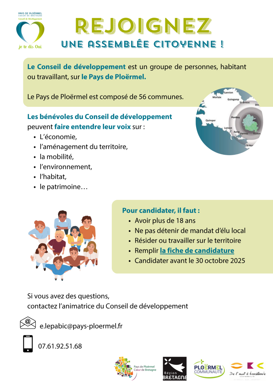 Le Conseil de développement du Pays de Ploërmel renouvelle ses membres à mi-mandat. Celui-ci réunit des personnes qui habitent ou travaillent sur le Pays de Ploërmel. Ce territoire est composé de 56 communes.