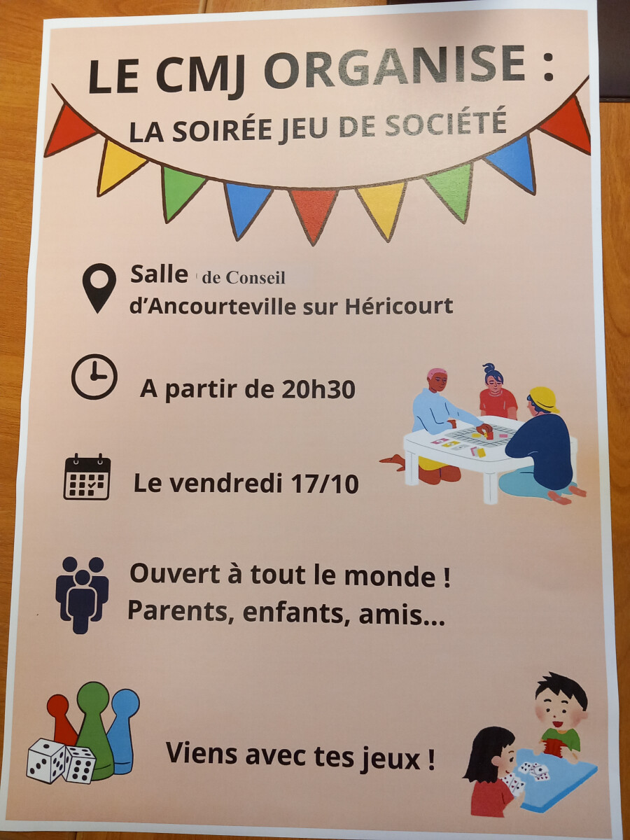 L e CMJ organise une soirée jeux le vendredi 17 octobre, à partir de 20h30, dans la salle du conseil.