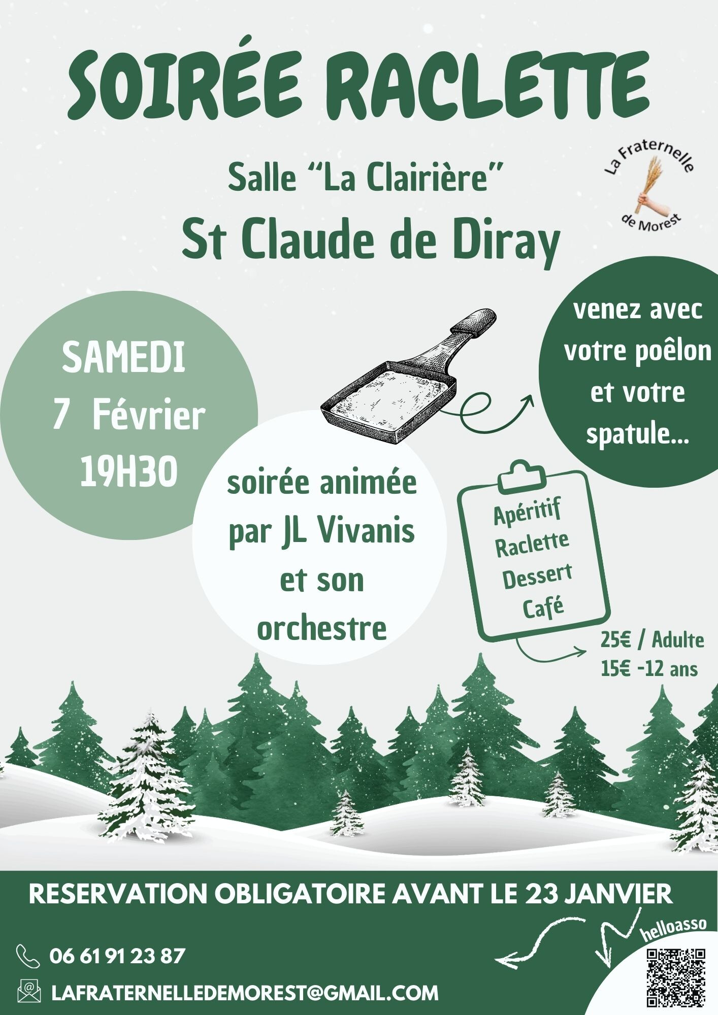 pour une soirĂ©e chaleureuse et festive. Au programme : une raclette gourmande et gĂ©nĂ©reuse, accompagnĂ©e dâun orchestre pour danser, sâamuser et partager un moment convivial entre amis, en famille ou entre voisins.