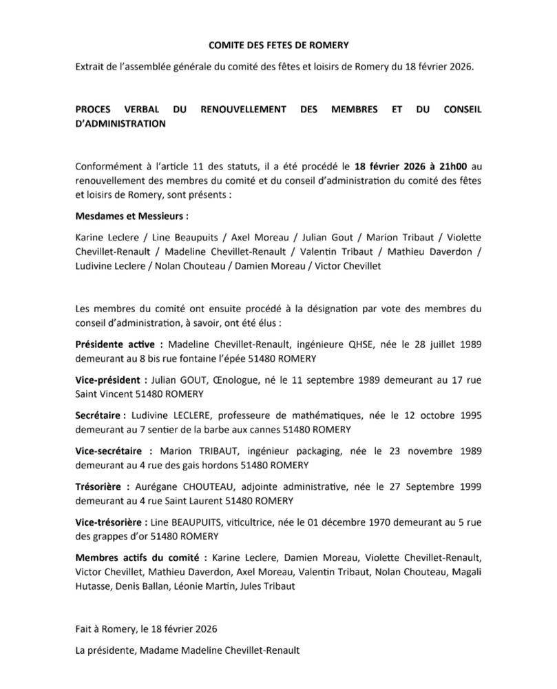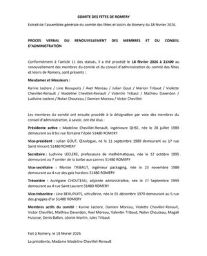 18 février 2026, vous trouverez ci-joint les noms des membres du comité des fêtes de Romery