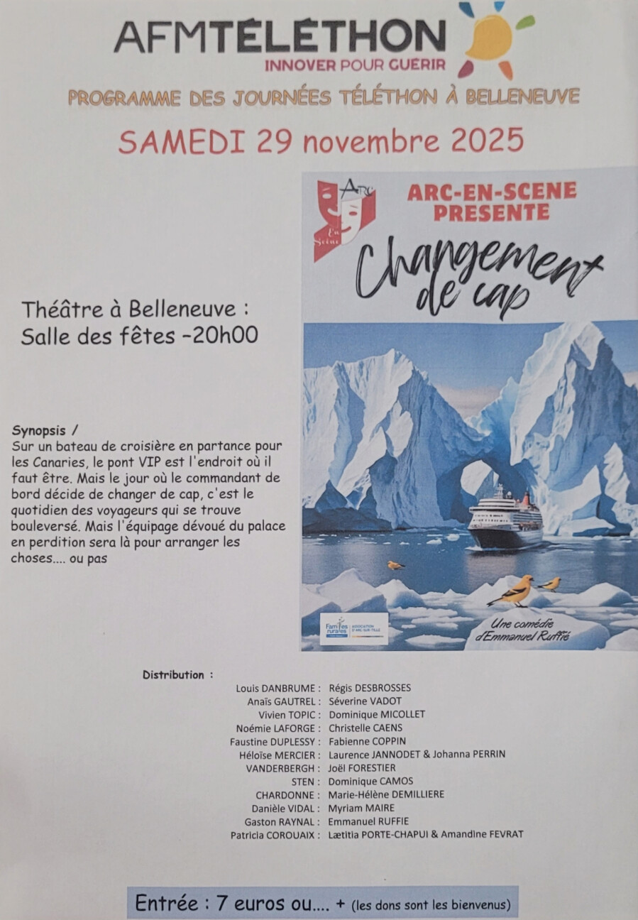 Le premier rendez-vous de cette action de solidarité a lieu samedi 29 novembre à 20h avec une pièce de théâtre à la salle des fêtes de Belleneuve.