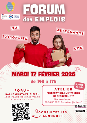 Le 17 février prochain, la Communauté de communes Mirebellois et Fontenois organise, en partenariat avec France Travail, un Forum des emplois à Mirebeau-sur-Bèze.