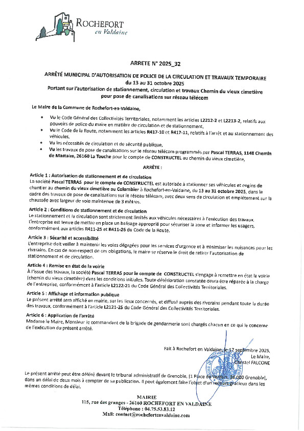Nous vous informons de la mise en place d'un arrêté de Police Municipale portant autorisation de circulation et stationnement temporaire pour travaux Chemin du vieux cimetière pour pose de canalisations sur réseau télécom
