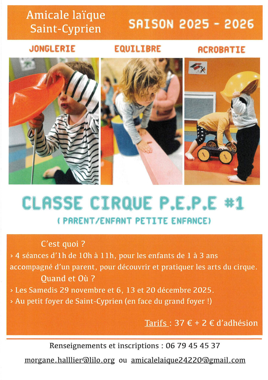 À partir de samedi 29/11/2025, l'Amicale Laïque de Saint-Cyprien propose une classe découverte du cirque à destination des tout-petits (1-3 ans) : la CLASSE CIRQUE P.E.P.E (Parent/Enfant, Petite Enfance).