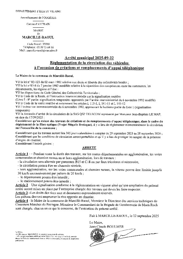 Arrêté de la circulation portant sur des travaux de créations et de remplacements de poteaux téléphoniques sur l'ensemble de la commune, dans le cadre du déploiement de la fibre optique (projet Mégalis Bretagne)