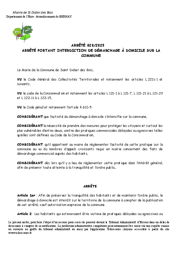 L'arrêté ci-dessous, interdit le démarchage à domicile sur la commune, sauf autorisation expresse de la mairie, afin de préserver la tranquillité des habitants et de lutter contre les pratiques commerciales abusives. Les citoyens victimes de démarchage agressif ou frauduleux sont invités à contacter la mairie ou la gendarmerie. De plus, les quêtes à domicile sont interdites, sauf autorisation municipale, mais la vente de calendriers par les postiers et sapeurs-pompiers reste autorisée. Les contrevenants s’exposent à des sanctions conformément à la réglementation en vigueur.