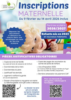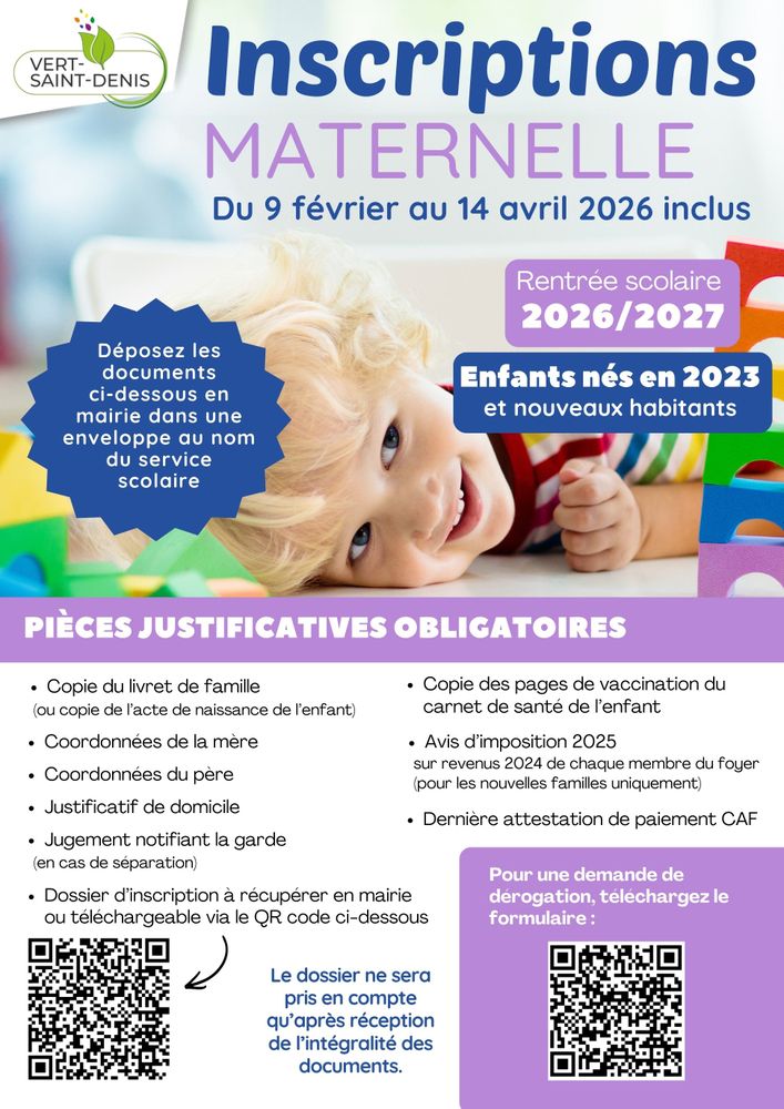 ✔️ Dossier d’inscription ➡️ À récupérer en mairie ou téléchargeable via le lien suivant : https://www.vert-saint-denis.fr/media/formulaire-inscription-maternelle-2026-2027.pdf