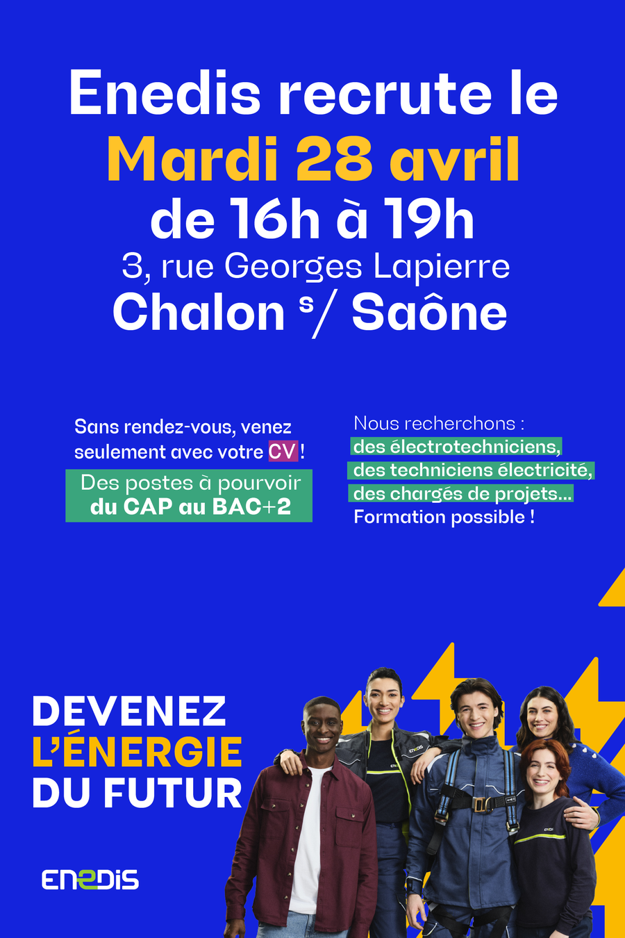 Enedis organise un job dating le mardi 28 avril, 3 rue Georges Lapierre à Chalon sur Saône.